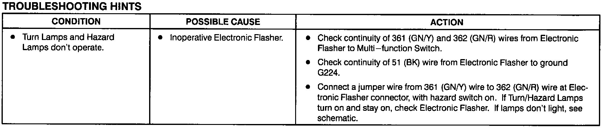 Turn/Hazard Lamps - Troubleshooting Hints: