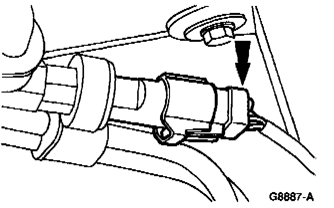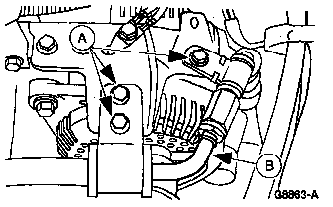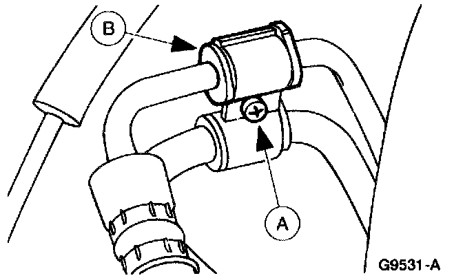 12. Remove the (A) upper power steering hose retaining bracket screw and open the (B) bracket.