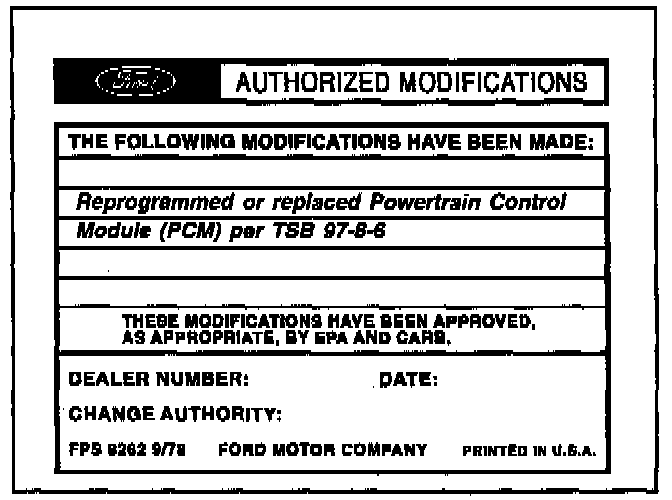 Obtain an Authorized Modification Decal (FPS 8262 - obtainable through DOES II, 25/pkg) and list the date, dealer number, and summary of modifications performed. Select a prominent place adjacent to the Vehicle Emission Control Information Decal suitable for installing the Authorized Modifications Decal. Clean the area, install the decal, and cover it with a clear plastic decal shield.