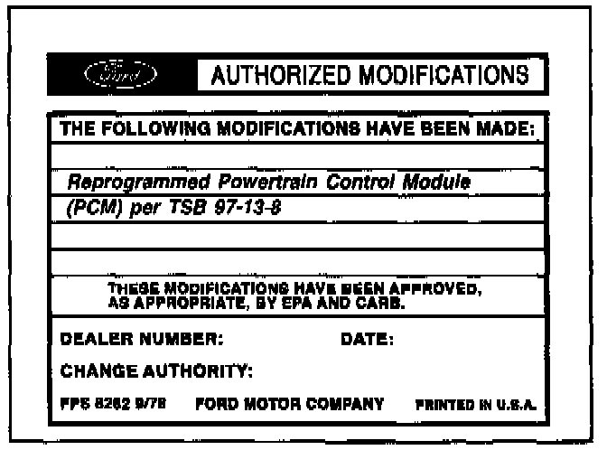 Obtain an Authorized Modification Decal (FPS 8262 - obtainable through DOES II, 25/pkg) and list the date, dealer number, and summary of modifications performed. Select a prominent place adjacent to the Vehicle Emission Control Information Decal suitable for installing the Authorized Modifications Decal. Clean the area, install the decal, and cover it with a clear plastic decal shield.