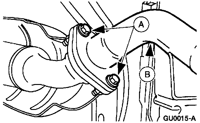 7. Remove the (A) TWC to muffler inlet pipe bolts and nuts and the (B) TWC. Discard the gasket.