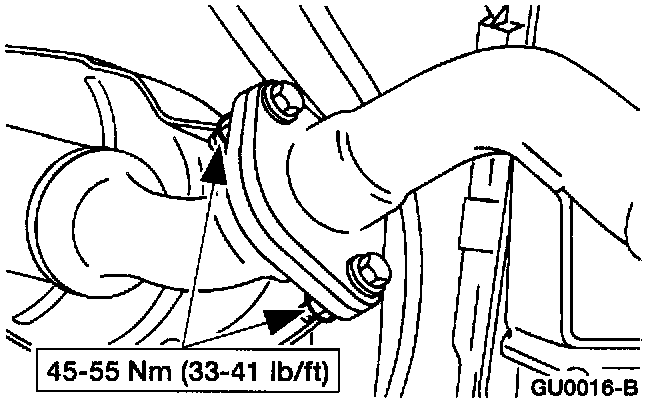 3. Install the two TWC to muffler inlet pipe and resonator bolts and nuts
