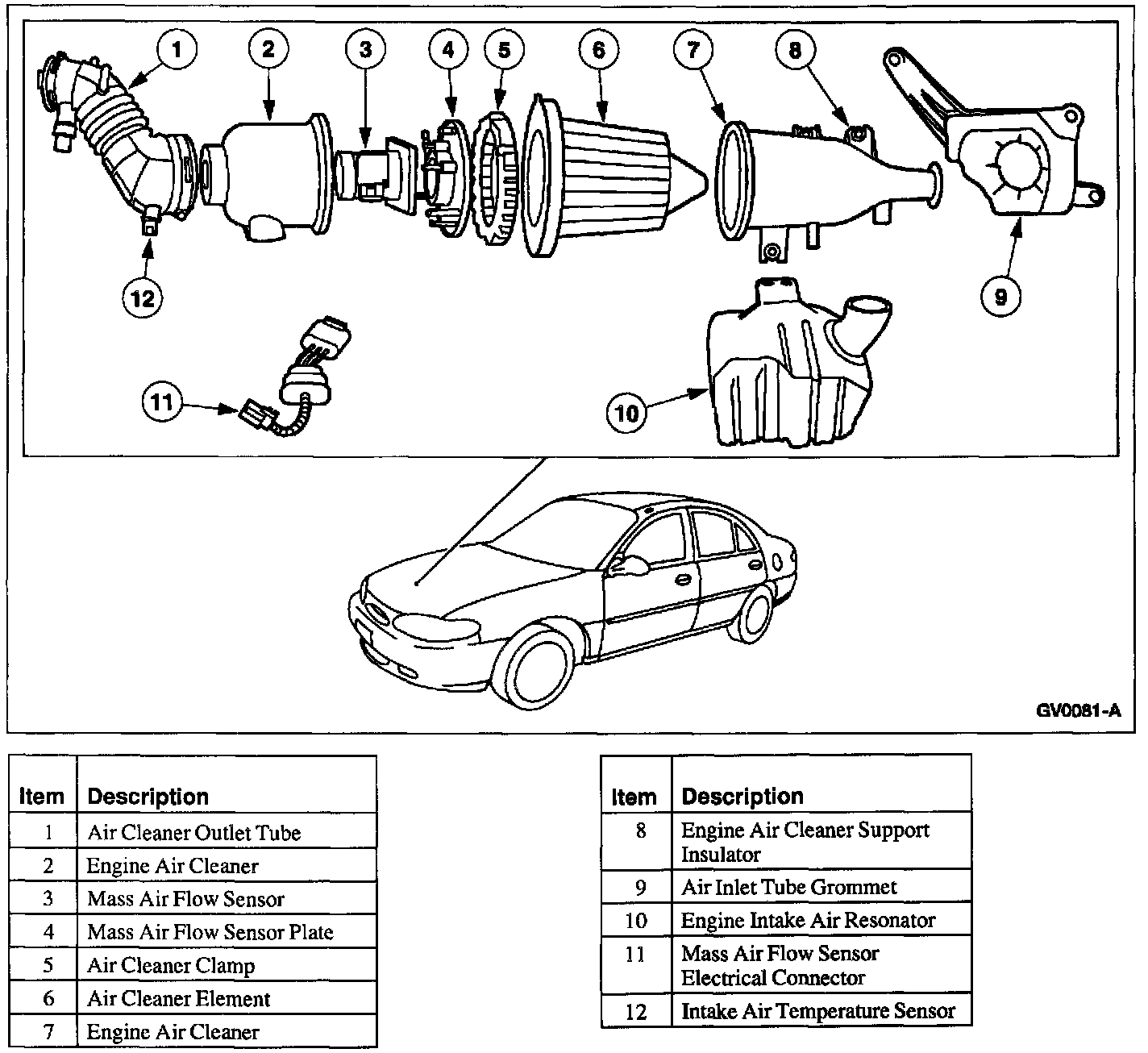 The air delivery system consists of the air cleaner outlet tube, air cleaner, mass airflow sensor, air cleaner element, air inlet tube, intake air temperature sensor, intake air resonator.