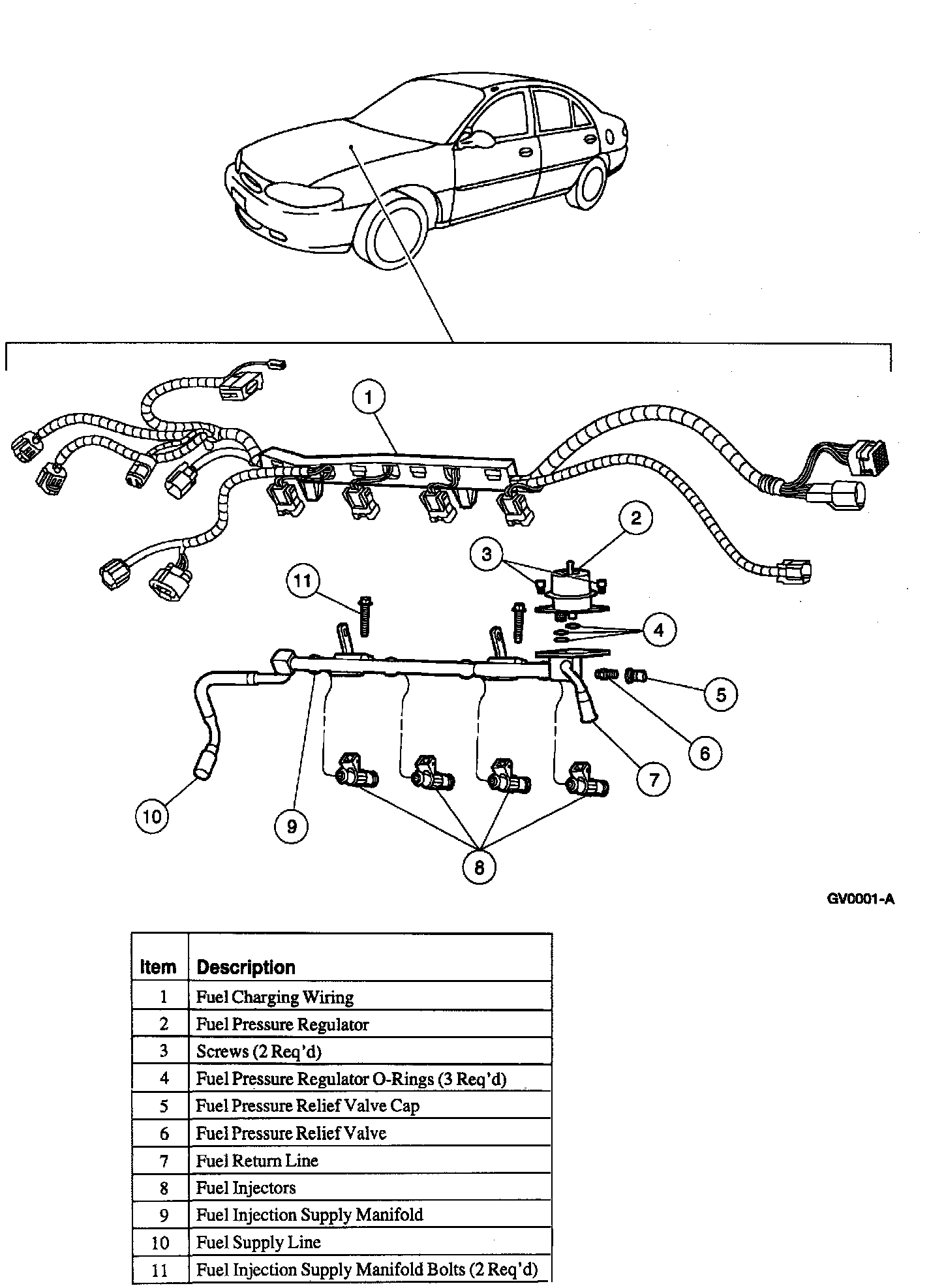 The fuel system consists of a fuel tank, fuel pump module, fuel supply lines, fuel filters, pressure test point, fuel rail, fuel injectors and fuel pressure regulator.