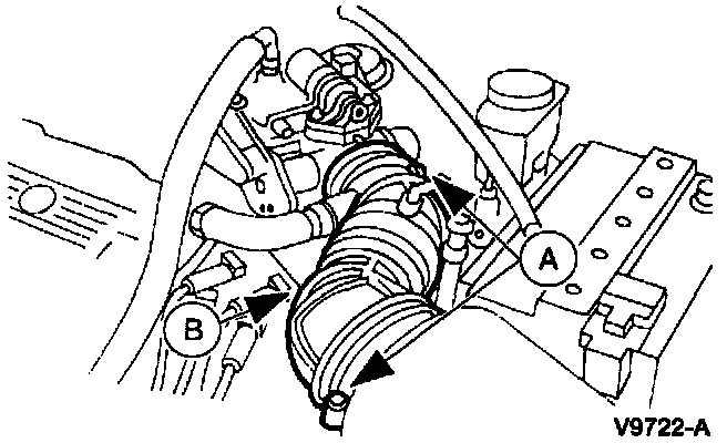2. Disconnect the (A) crankcase air check valve hose and the (B) brake boost aspirator vacuum hose.