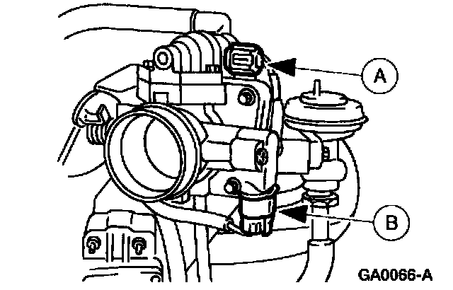 4. Disconnect the (A) idle air control valve and the (B) throttle position sensor electrical connectors.
