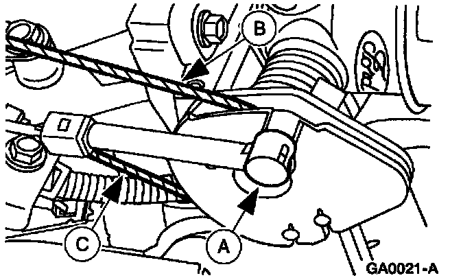 3. Disconnect the (A) speed control actuator, the (B) accelerator cable, and the (C) throttle valve control actuating cable.