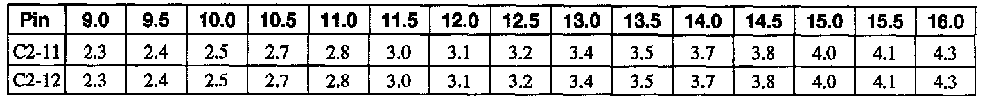 The air bag diagnostic monitor measures system voltage at pins 11 and 12 of the air bag diagnostic monitor connector C2. The voltage at these pins varies with charging system voltage (the expected voltages at pins 11 and 12 are shown in the chart). If the air bag diagnostic monitor measures a voltage of 2.0 volts or less at pins 11 and 12, the air bag diagnostic monitor will flash out DTC 13 to indicate a possible short to ground. When flashing DTC 13, the air bag diagnostic monitor blows the internal thermal fuse. This disables the air bag deployment circuits. If the voltage at pins 11 and 12 returns to normal, a DTC 51 will be present due to the open internal thermal fuse. Refer to Pinpoint Test T, DTC 51.