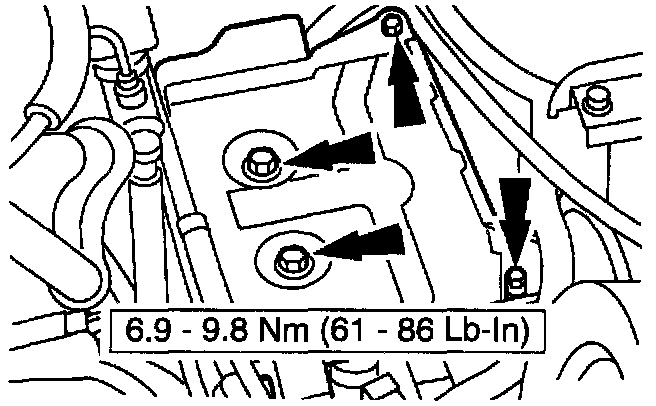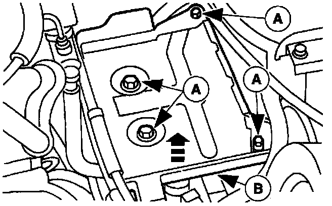 4. Remove the (A) four battery tray bolts and remove the (B) battery tray.