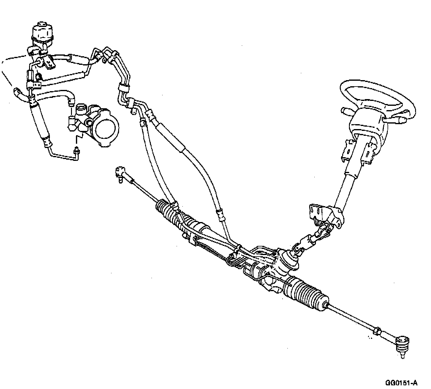 The power steering system uses hydraulic pressure generated by the power steering pump to reduce the force required to turn the steering wheel. The power steering system has a typical rack and pinion design consisting of the following components: