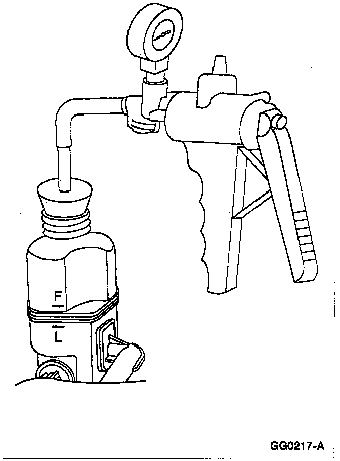 3. Tightly insert the rubber stopper of the air evacuator assembly into the power steering pump reservoir. Connect tubing, vacuum hose and tester to the stopper.