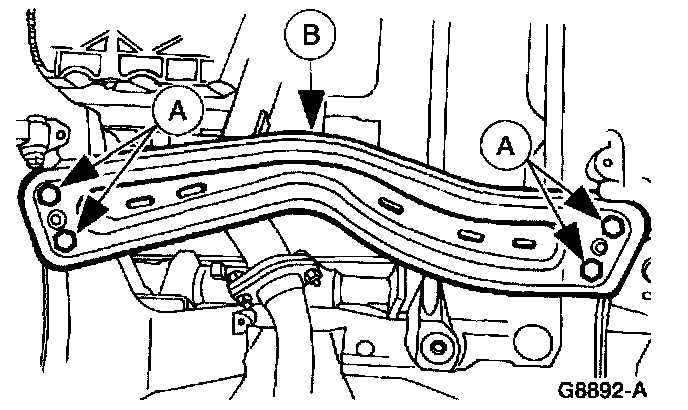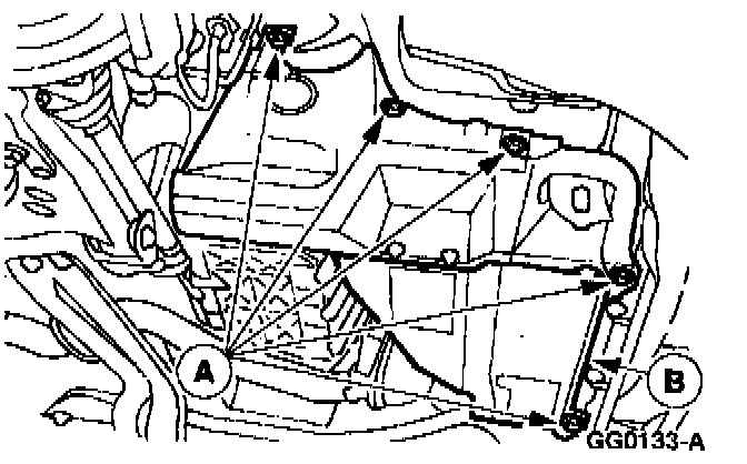 8. Remove the (A) six bolts and the (B) RH splash shield.