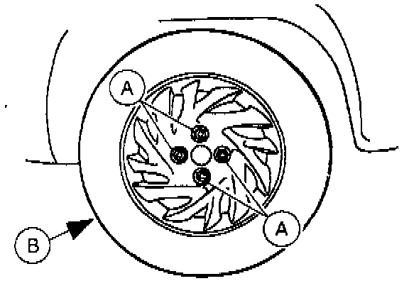 5. Remove the (A) lug nuts and the (B) front wheel and tire assemblies.