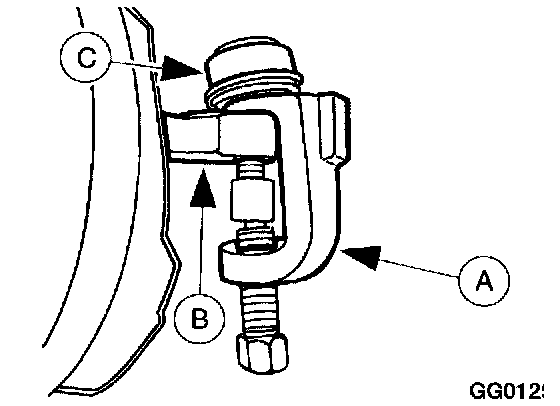 7. Use (A) Tie Rod End Separator T85M-3395-A to separate the (B) front wheel knuckle from the (C) tie rod end.