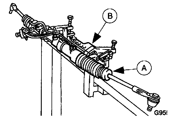18. Install the (A) steering gear into the (B) Steering Gear Holding Fixture D87P-3504-B or equivalent.