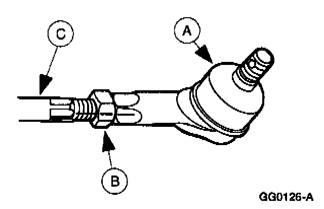 23. Place alignment marks on the (A) tie rod ends, the (B) tie rod end jam nuts and the (C) front wheel spindle tie rods.
