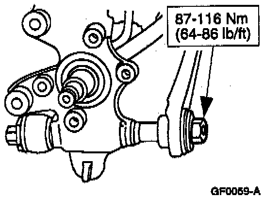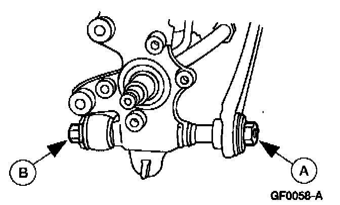 8. Remove the rear suspension arm and bushing rear (A) nut and (B) bolt and remove the rear wheel spindle.