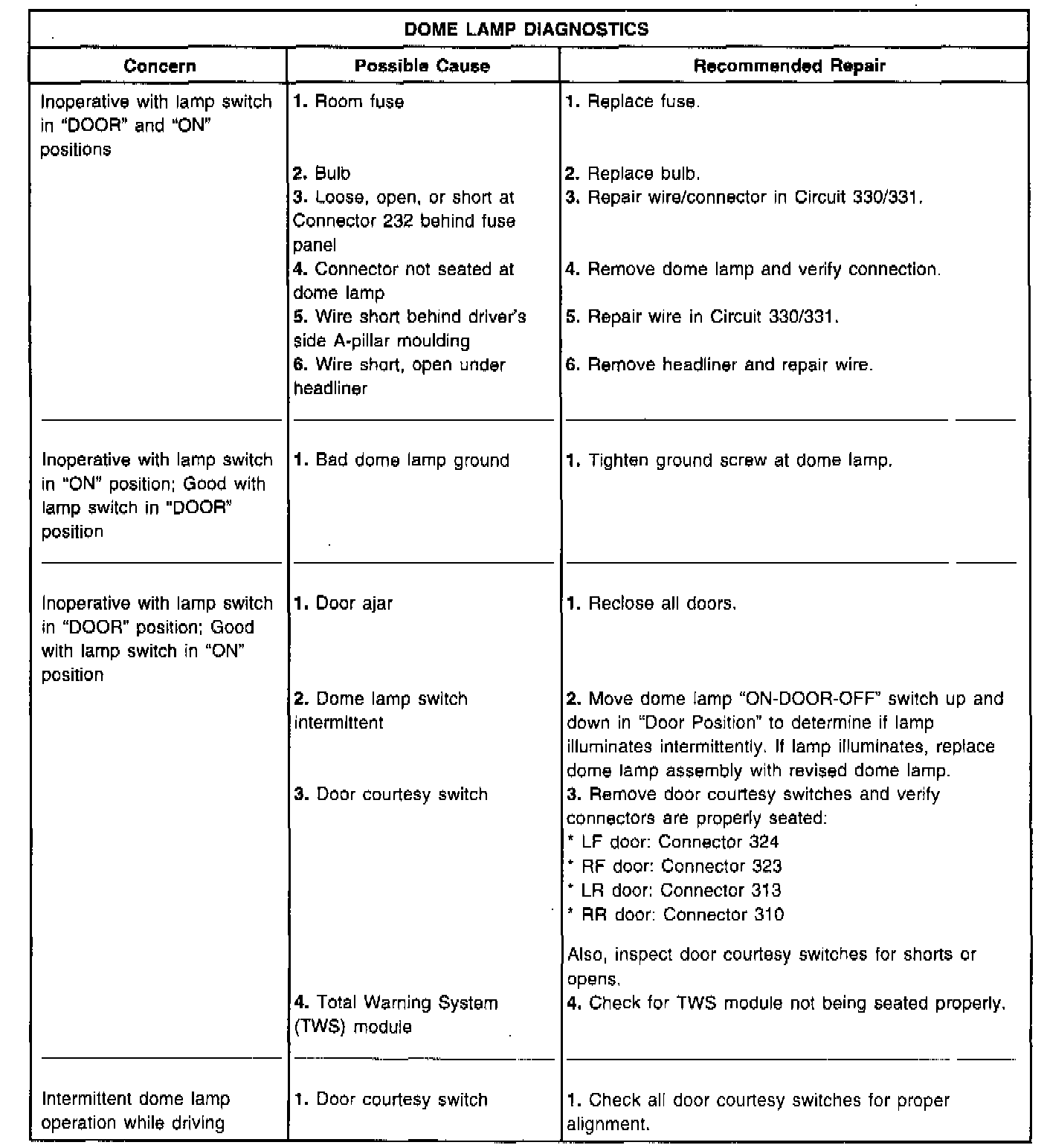 This TSB article includes comprehensive diagnostics for intermittent or inoperative dome lamp issues. Refer to the following Diagnostic/Service Procedure for details.