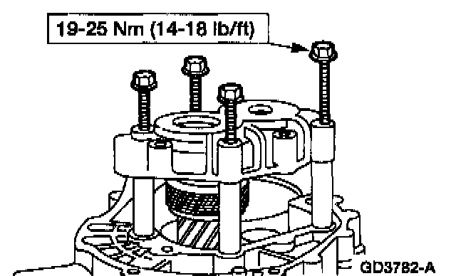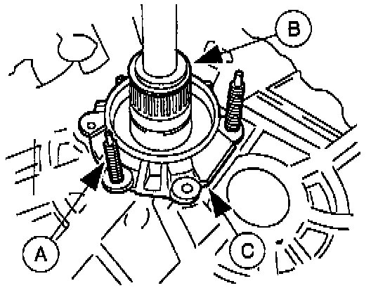 NOTE: Whenever the transaxle is disassembled, the bearing preload must be adjusted. The output gear bearing preload is adjusted by selective shims inserted under the bearing cup. To determine the correct thickness of the shim(s), use the appropriate shim selection set along with the following procedures.1. Use (A) Valve Body Guide Pins T80L-77100-A to align the torque converter stator support. Use (B) Step Plate D80L-630-6 or equivalent to press the (C) torque converter stator support into the torque converter housing.