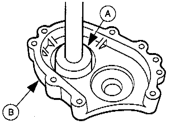 14. Remove the bolts, washers, bearing housing, gauge, and bearing cup. Use (A) Bearing Cup Replacer T77F-1217-B to press the selected shim(s) and bearing cup into the (B) bearing housing.