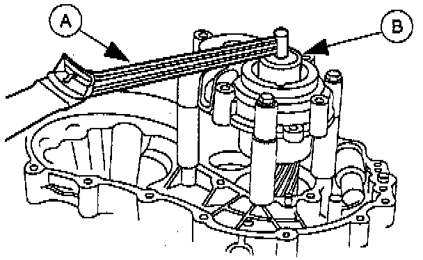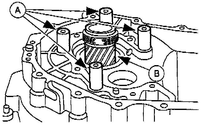 6. Place four collars (part of T88C-77000-JF) on the (A) converter housing. Place Shim Selection Gauge T91P-77000-B on the (B) output gear. Be sure to turn the two halves of the gauge to eliminate any gap between them.
