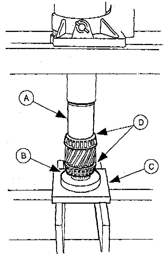 2. Use (A) Dust Boot Replacer T87C-5493-A, (B) Bearing Cone Replacer T87C-77000-D, and (C) Axle Bearing/Seal Plate T75L-1165-B to press the new output (D) bearings onto the output gear.