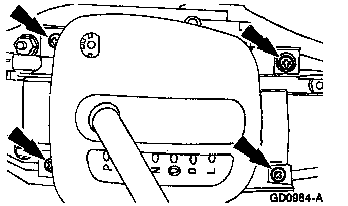 1. Place the gearshift lever in the PARK (P) position.2. Loosen the four transmission control selector dial bezel screws.