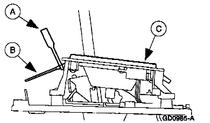 3. Place a (A) stiff wire in the (B) slider panel and position the pointer on the (B) slider panel to align with the PARK (P) position on the (C) transmission control selector dial bezel.