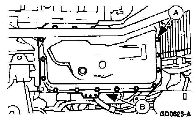 3. Place a suitable container beneath the transmission fluid pan, then remove the (A) transmission fluid pan bolts and the (B) transmission fluid pan.