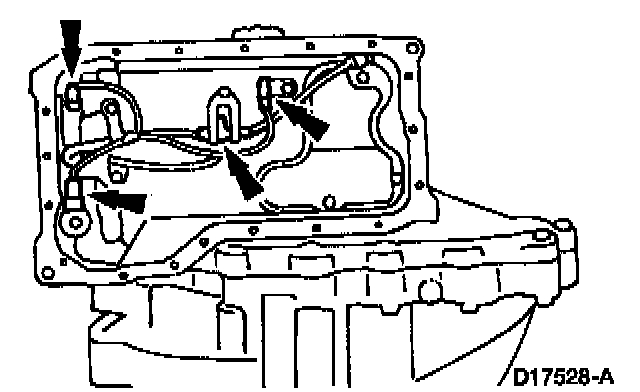 NOTE: Remove all the bolts securing the transmission fluid pan except the four corner bolts; then remove the two from the rear and allow the pan to drain.