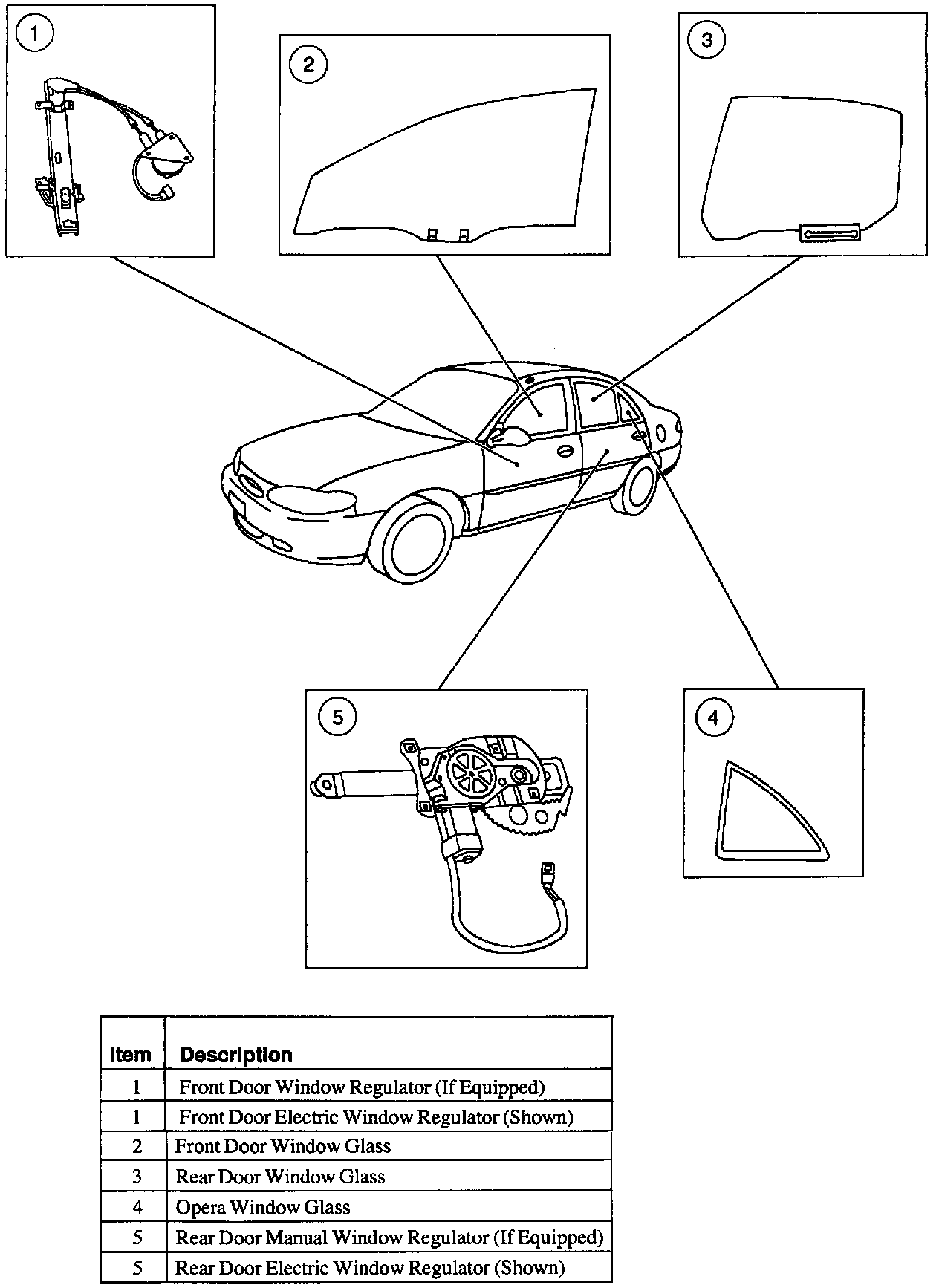 The front door window glass and the rear door window glass are raised and lowered by a manual (or electric, if equipped) window regulator. The door window glass is retained in the door by the window regulator, window run channel and the rear door glass run retainer and division bar (rear door only).
