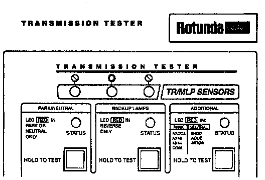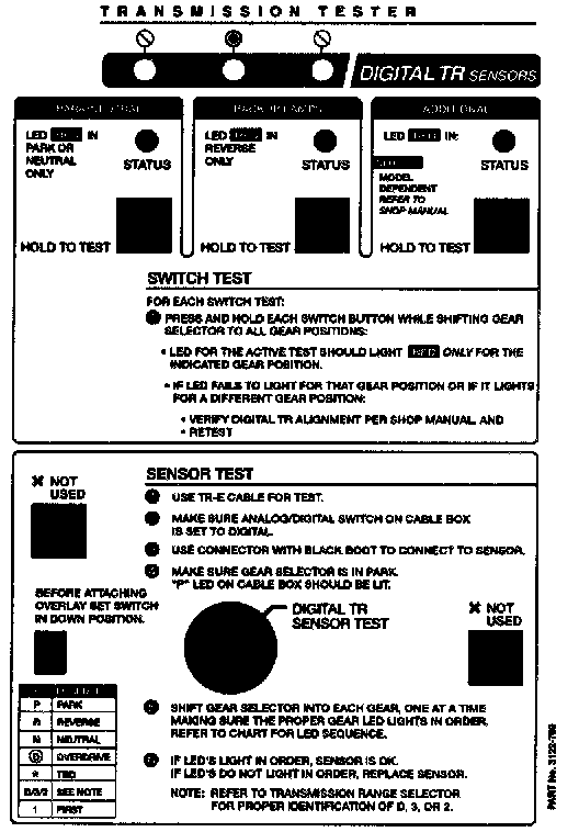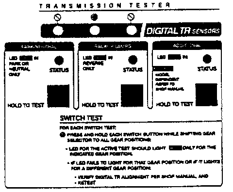 The transmission tester allows you to test the digital TR or analog TR sensors independent of the vehicle electronics. TR sensor testing is divided into five steps:
