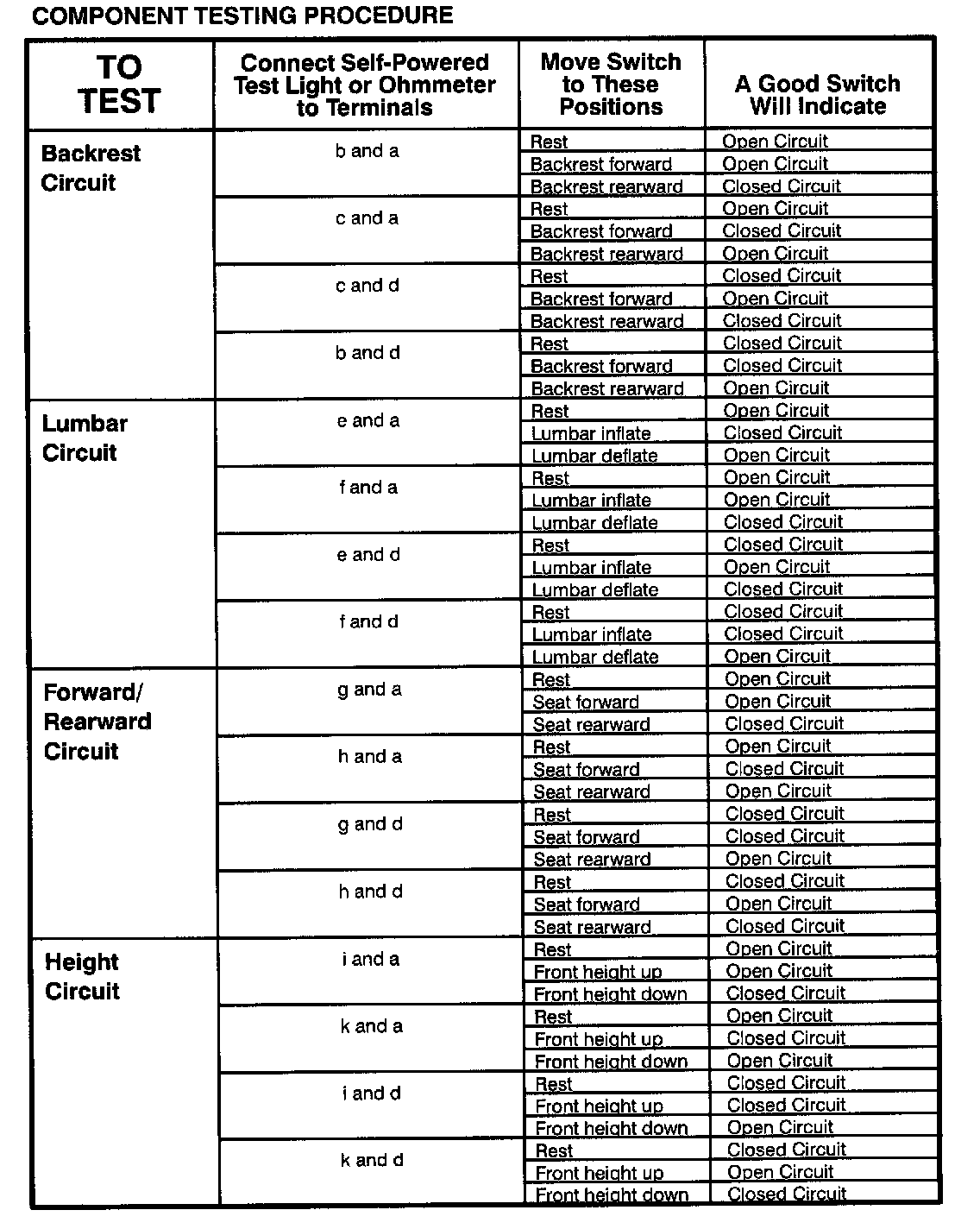 The component connector MUST BE REMOVED before testing. To test a single circuit within the component, select that circuit under the column TO TEST. If you wish to test the complete component, perform all tests.