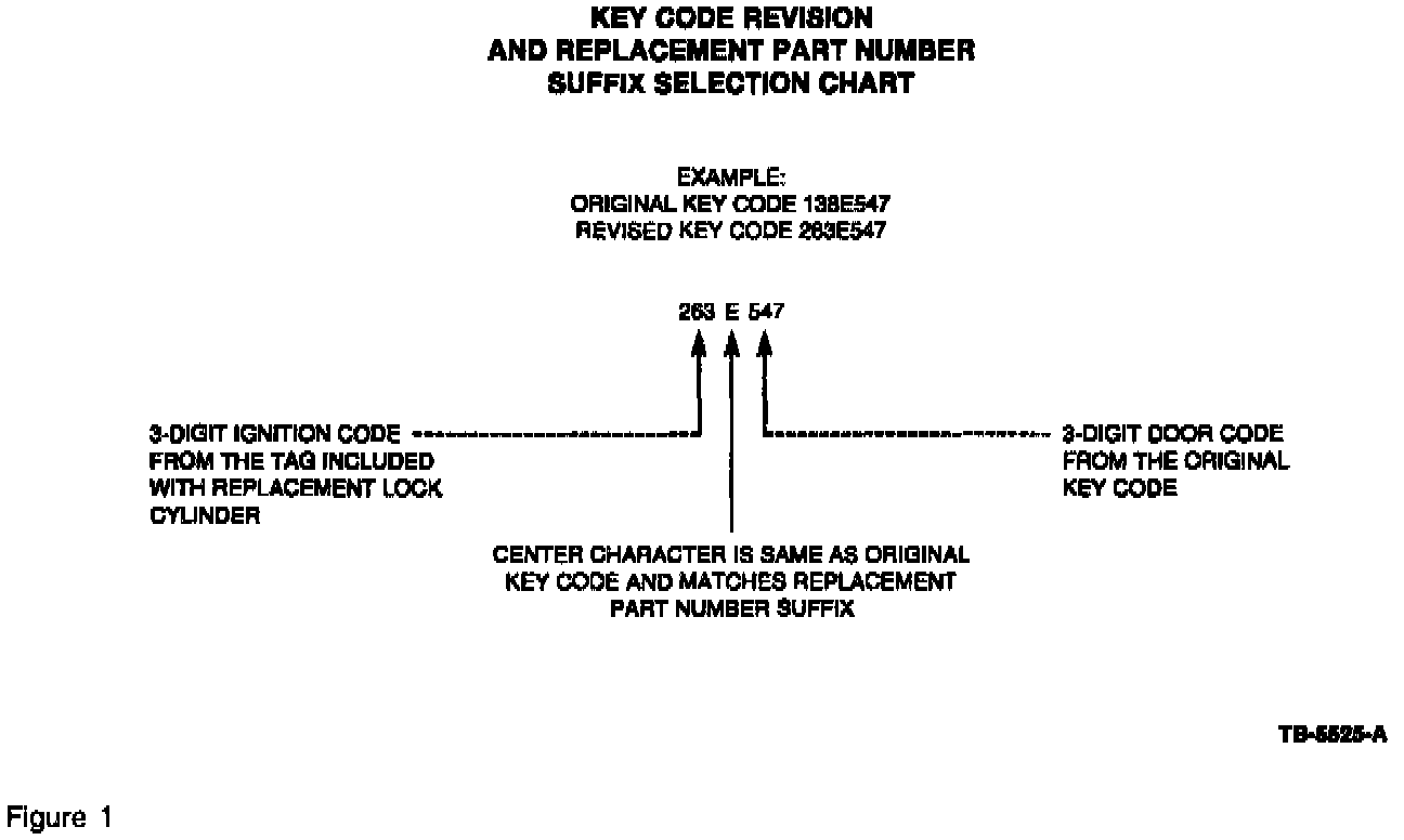 KEYS INCLUDED WITH NEW IGNITION LOCK CYLINDERS ARE CUT FOR THE IGNITION ONLY. IN ORDER FOR THE KEYS TO FUNCTION IN THE DOOR LOCKS, THE KEYS MUST BE CUT TO THE DOOR CODE OF THE ORIGINAL LOCKSET. THE KEY CODE WILL CHANGE UPON INSTALLATION OF THE REPLACEMENT LOCK CYLINDER (FIGURE 1).