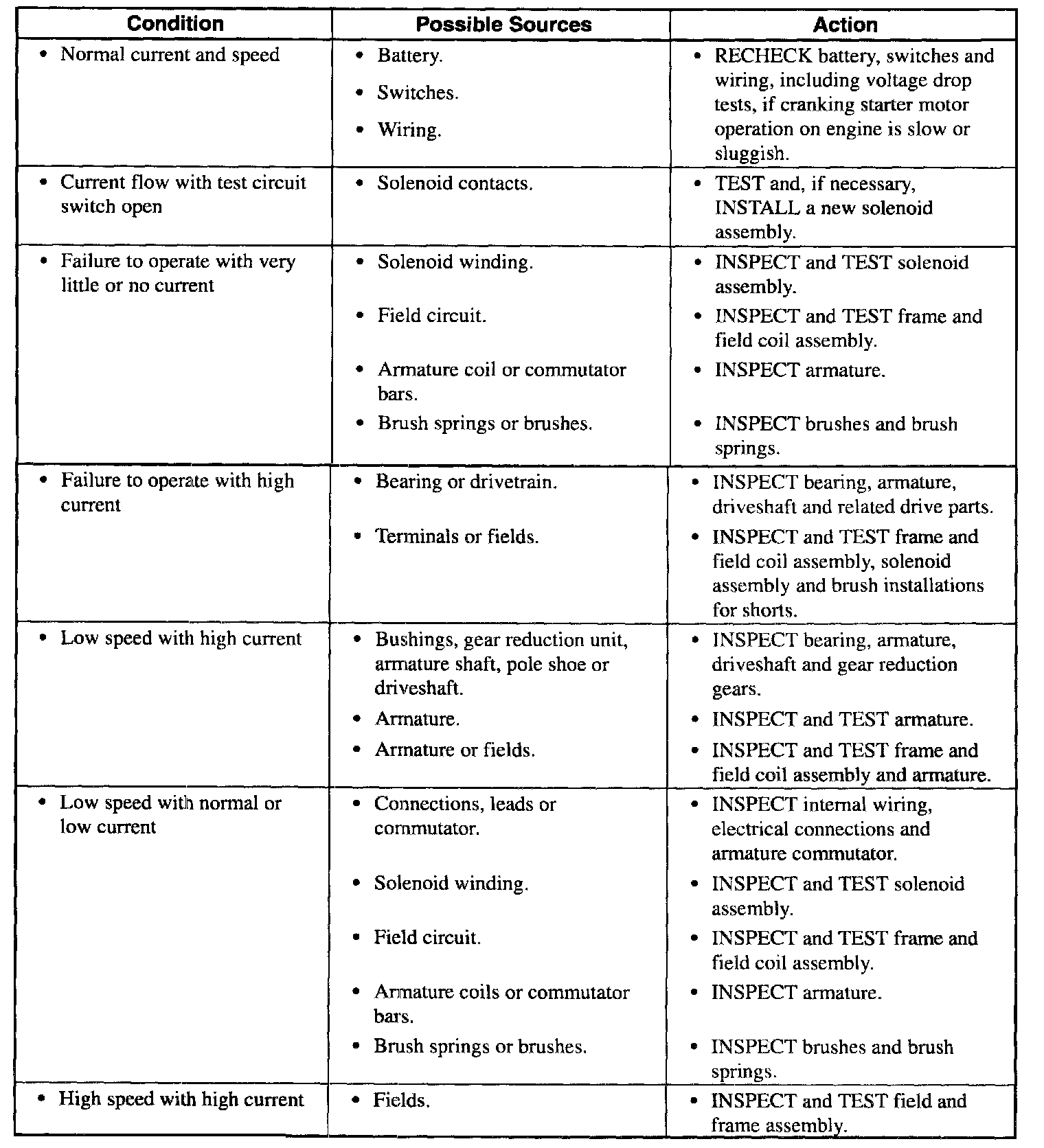 6. If the voltage is lower than specified, or if the amperage is higher than specified. The Symptom Chart shows the results to determine the cause and corrective action.