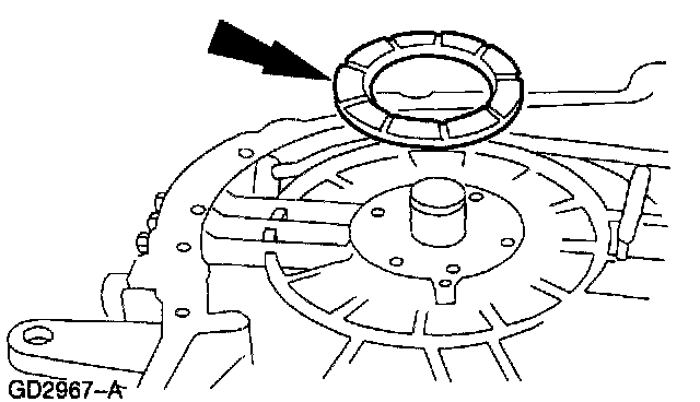 47. Use petroleum jelly and install the selected No. 10 drive sprocket thrust washer on the torque converter housing.