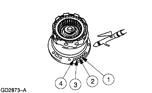 Check the following passages of the forward/coast/direct clutch cylinder and reverse clutch drum with moisture-free compressed air, regulated to 276 kPa (40 psi).
