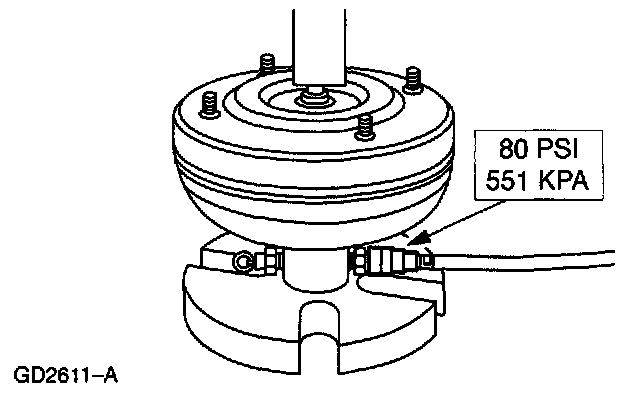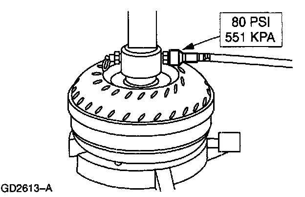 Apply air pressure to valve on Torque Converter Leak Check Tool and Gasket (014-R1075).