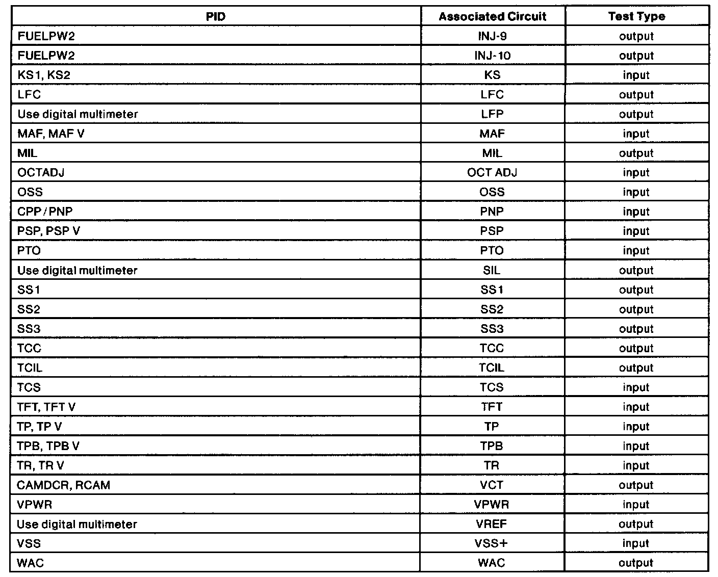 This chart is used to determine which test to run for the suspect circuit. Corresponding PIDs to each circuit are listed. Some circuits do not have an associated PID and will be measured with a digital multimeter. If the vehicle is a coil pack system with no start, perform the ignition test with the distributorless ignition system tester.