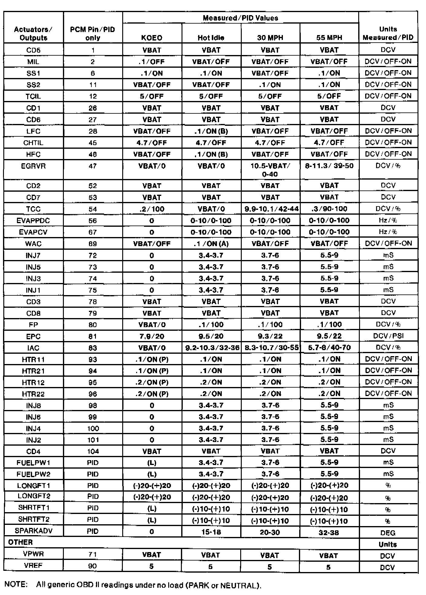 GENERIC OBD II PID VALUES