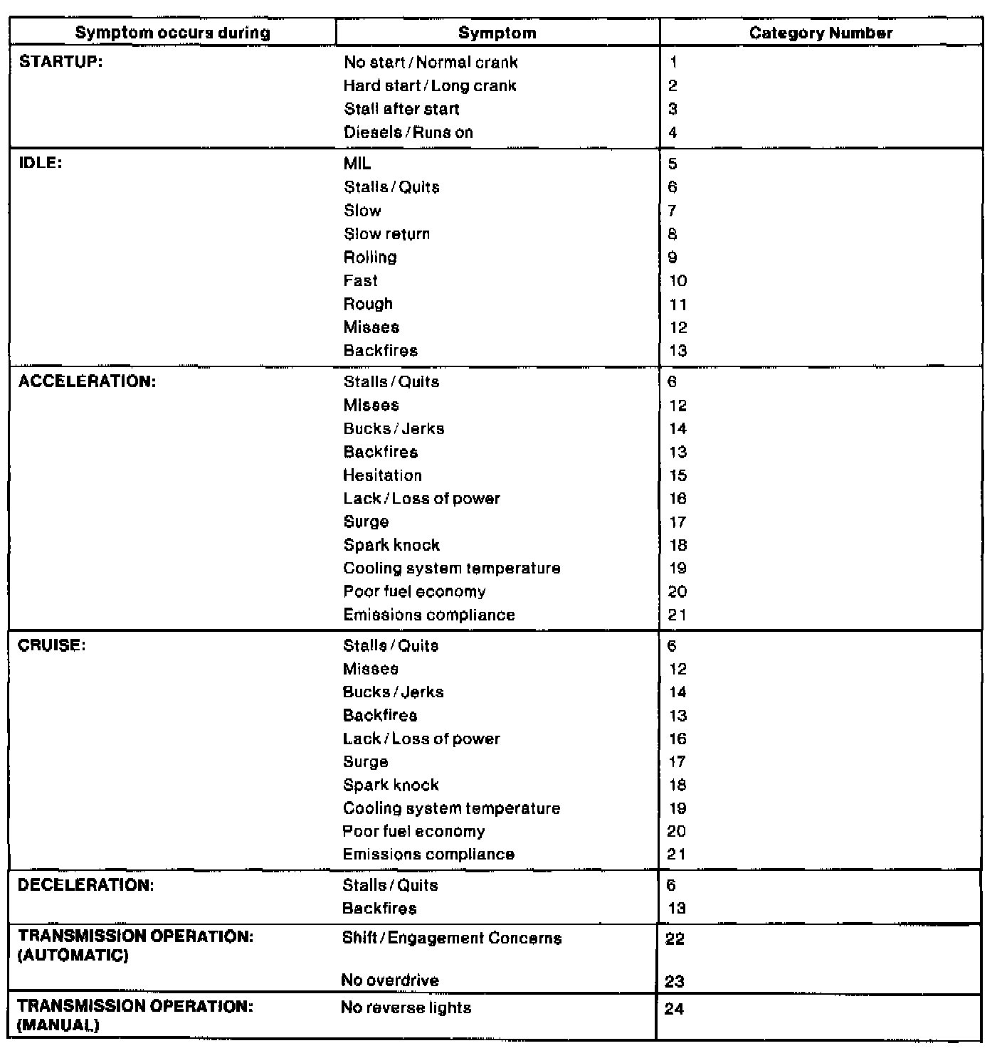 The Reference Value Symptom Chart is used to provide guidance in selecting the appropriate PID or measured signal related to the fault area. Select a symptom from the symptom chart along with the category number and proceed to the PID/Measured Signal Chart. For multiple symptoms, select the most evident. Reference Value PID/Measured Signal Chart