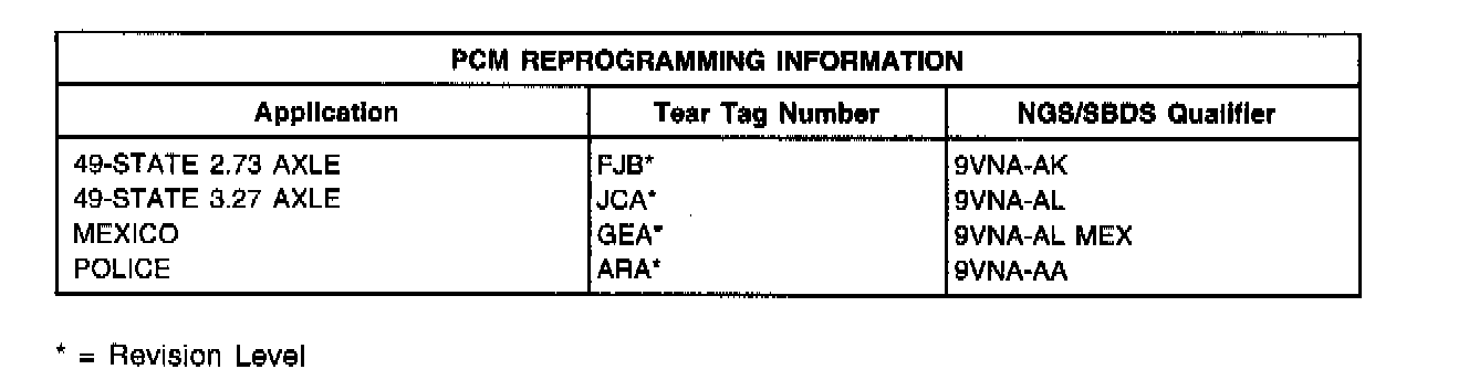 2. If no problem was found, reprogram the PCM with the latest level calibration using Service Bay Diagnostic System (SBDS) or New Generation Star (NGS) Tester. Refer to the following PCM Reprogramming Information Chart to identify the appropriate calibration.