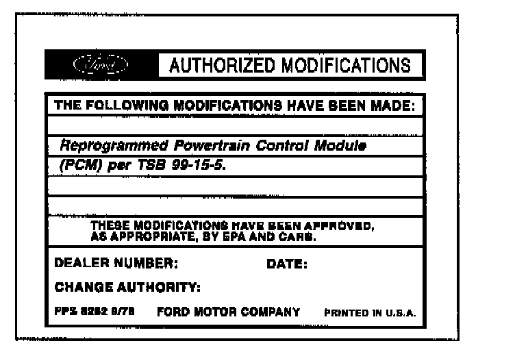 Obtain an Authorized Modifications Decal (FPS 8262 - obtainable through DOES II, 25/pkg) and list the date, dealer number, and summary of modifications performed. Select a prominent place adjacent to the Vehicle Emission Control Information Decal suitable for installing the Authorized Modifications Decal. Clean the area, install the decal, and cover it with a clear plastic decal shield.