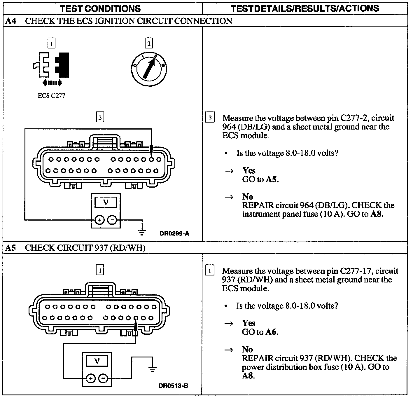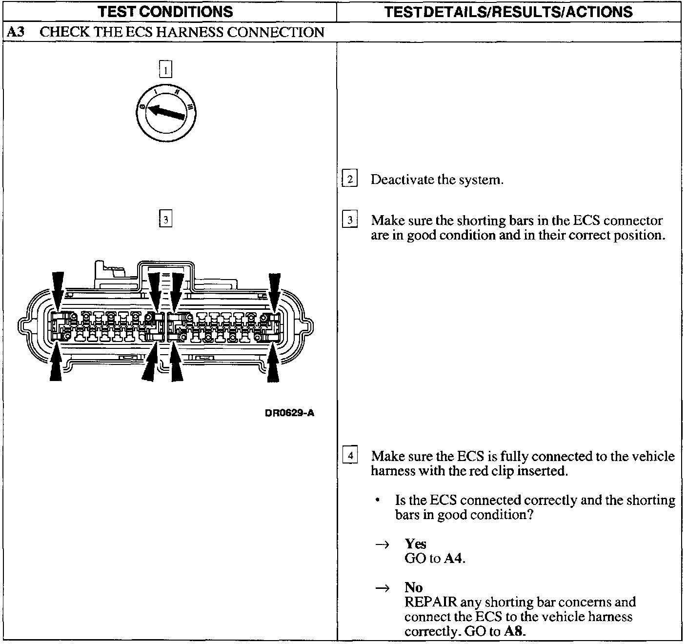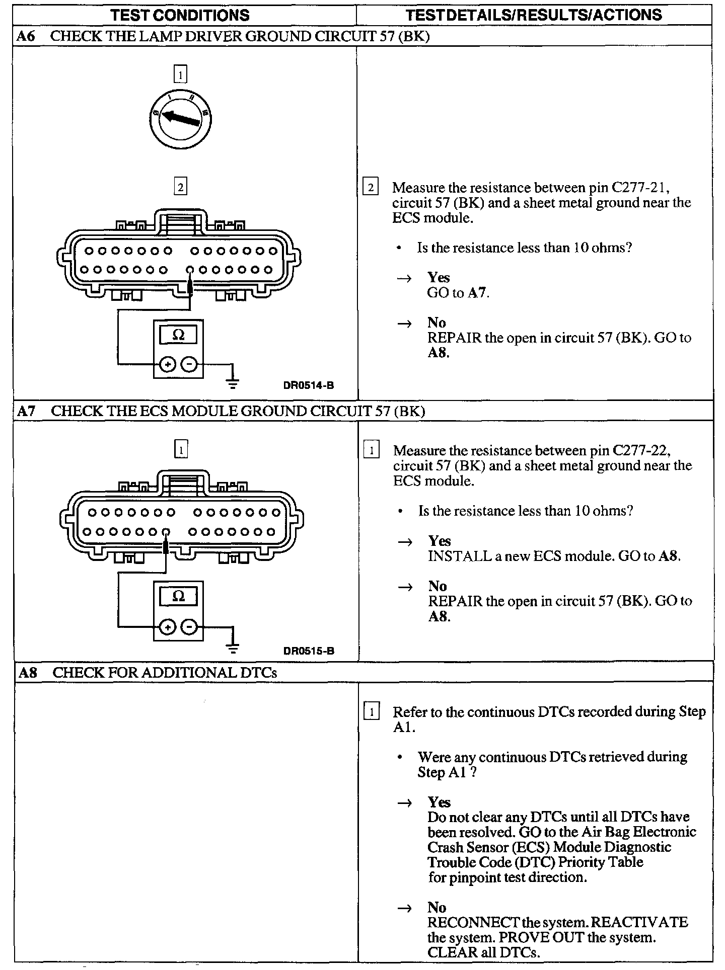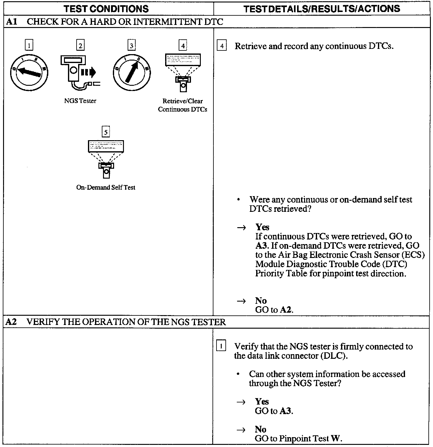 The air bag Electronic Crash Sensor (ECS) module will communicate Diagnostic Trouble Codes (DTCs) through the New Generation Star (NGS) Tester using the Data Link Connector (DLC). If the NGS Tester displays NO COMMUNICATION when retrieving continuous DTCs, use this pinpoint test to troubleshoot the system.
