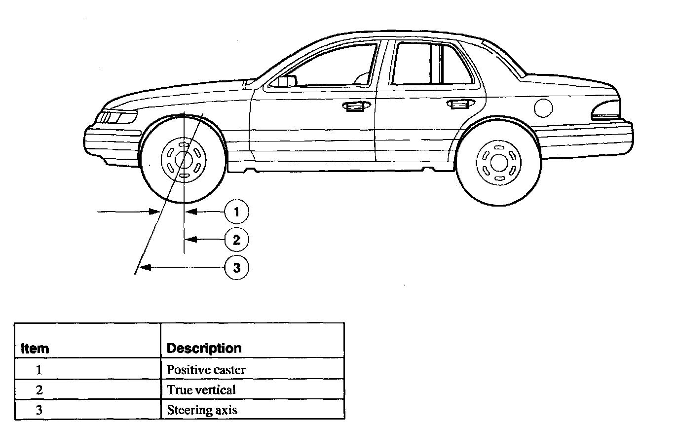 Caster is the deviation from vertical of an imaginary line drawn through the ball joints when viewed from the side. The caster specifications will give the vehicle the best directional stability characteristics when loaded and driven. The caster setting is not related to tire wear.