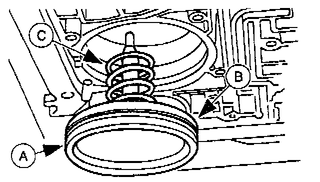 3. Remove the (A) reverse band servo cover , (B) reverse band servo piston and rod and (C) reverse band servo spring.