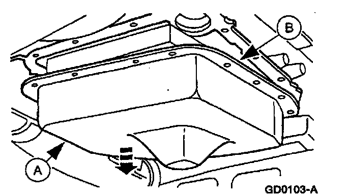 6. Remove the (A) transmission fluid pan and (B) transmission fluid pan gasket.