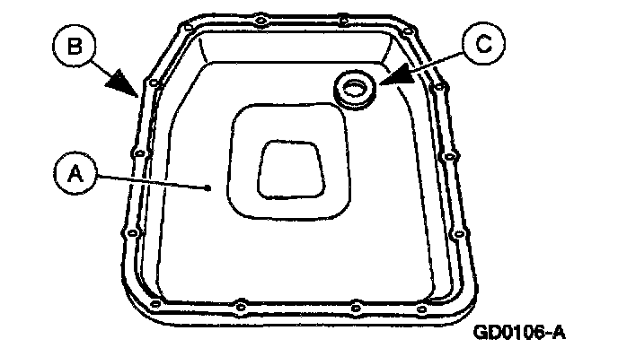 10. Clean and inspect the (A) transmission fluid pan, (B) transmission fluid pan gasket and (C) magnet.