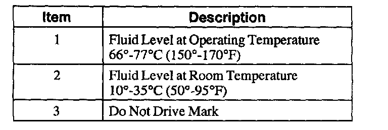 Fluid Level CheckCAUTION: The vehicle should not be driven if the fluid level indicator shows the fluid below the DO NOT DRIVE mark or internal failure could result.