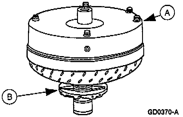 2. Mount (A) torque converter on the (B) front pump support with the splines on the one-way clutch inner race, engaging the mating splines of the front pump support.